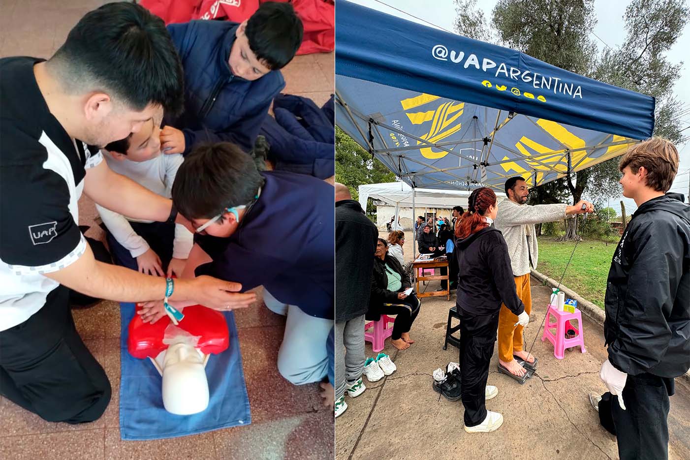Las jornadas incluyeron talleres de primeros auxilios en escuelas primarias y secundarias, charlas de promoción de hábitos saludables y espacios de prevención de adicciones. Los estudiantes también realizaron visitas casa por casa en los barrios, donde compartieron meriendas, entregaron folletos educativos y ofrecieron controles como toma de presión arterial y medición de glucemia.