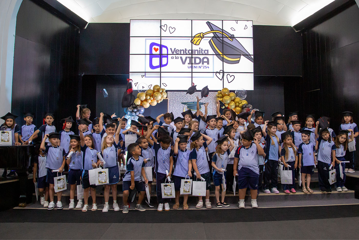 La alegría de los niños fue el sello distintivo del acto: saludos a los padres, risas compartidas y, especialmente, los emotivos abrazos entre los pequeños y sus maestras al recibir diplomas y medallas, reflejo del fuerte vínculo construido durante el año. Momentos como el vídeo recordatorio y la canción de despedida, con letra y música compuestas por una de las docentes, despertaron lágrimas y emociones en todos los presentes.